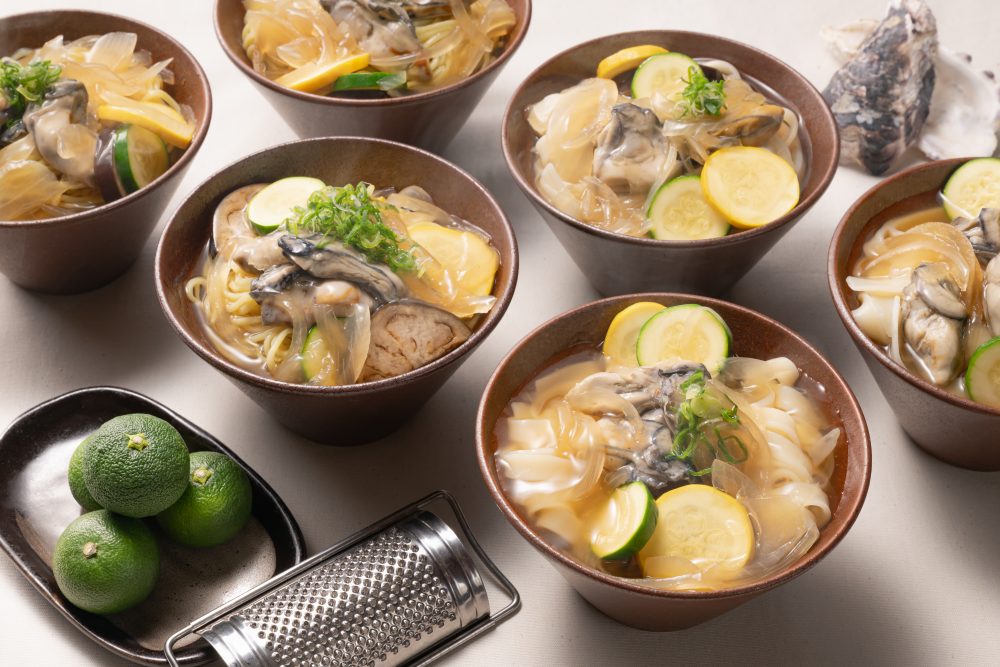 请在酒店眼前广阔的矢湾丰富的大海中生长的牡蛎和使用了夏季蔬菜的美味馅,用容易缠绕的黄面享用。